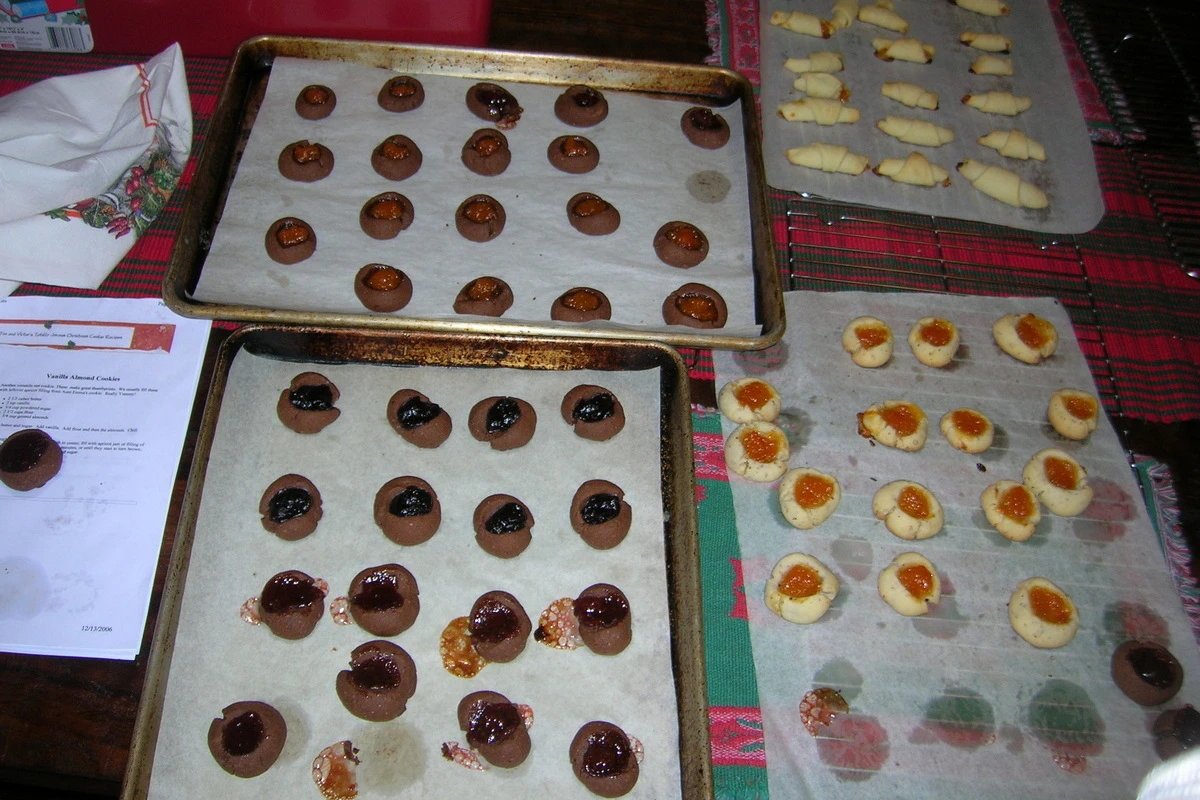 Pizza cleared up, visitors gone, it was back to cookies. It was time to roll out and fill Aunt Emma’s. Gino and I took turns rolling the dough paper thin, and then it was cutting, filling, folding, crimping and forming. It’s quite an ordeal for such a small cookie, but tradition is tradition – and they are worth every minute spent making them!