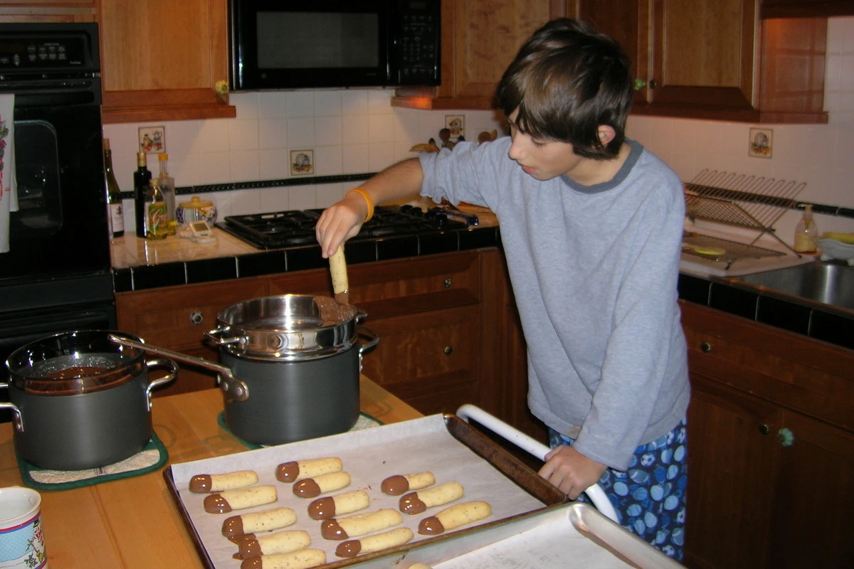We filled them with Aunt Emma’s apricot filling, and some with blueberry and some with cherry. These are melt-in-your-mouth butter cookies, and the chocolate version this year is really rich and fudgy. We took a bit of the dough and made logs – which were then dipped in chocolate. One of the great things about the nut cookies is their versatility. One dough can make several different cookies – all unique.