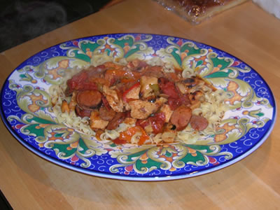 Last night I decided to just do a bit of a clean out the ‘fridge dinner… I took the leftover sausages – andouille, chorizo, and spicy Italian – and sliced them up. I fried up a bunch of onions and mixed peppers, and added tomatoes and lots of chipotle pepper and cumin. I then grilled a couple of chicken breasts and added them to the pot.