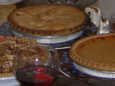 It was Steve’s birthday a few days back, so – because he specifiically said no birthday cake – we got him a birthday cake. Well – his sister did. From an Italian bakery in North Jersey. It was a Napoleon cake. Layer after layer of flaky dough filled with a rich cream filling and topped with a silky fondant-type icing… OMG! Leah made a Cranberry Pear pie with a crumb topping that was fantastic. Aunt Lonnie brought pumpkin and apple pies from her favorite Philly bakery, and Joanna brought her famous wedding rings – that 8 year old Elizabeth made! Plus brownies and, and… I’m drawing a blank. I know there was more…