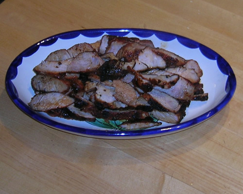I took boneless pork steaks and covered them liberally with ancho, pasillo, birdseye, and arbol chili powders, and a bit of salt. Onto the grill they went.