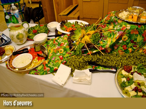We started off with assorted cheeses, salmon pinwheels, curried chicken satays, crudite with dips, breads with tapenades… Silver trays, crystal bowls…