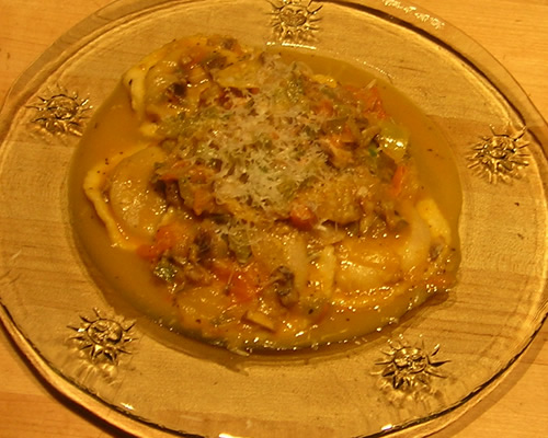 Dinner tonight was a snap. I had picked up some port0bello ravioli at work the other day and decided tonight was the night for ’em. It’s a bit wet and chilly outside. Definitely a pasta night!