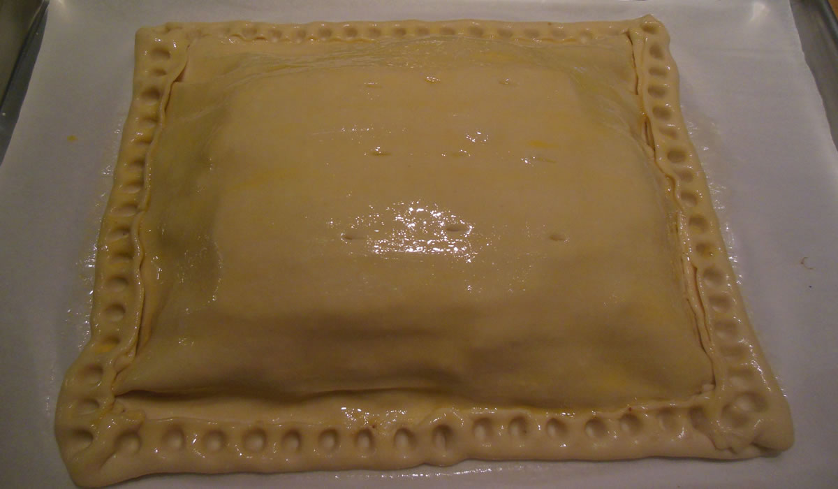 - Roll second sheet of puff pastry out to about 1/3 to 1/4 inch thick. Drape second sheet over stuffed fillets, making sure that there is enough of the top sheet to tuck under the bottom sheet of puff pastry. Trim the top sheet of pastry about 1/2 inch larger than the bottom sheet. Brush underside of top pastry sheet with water and tuck under bottom sheet of puff pastry pressing lightly to totally encase the fish and stuffing package. Place the sealed packet on the prepared baking sheet, and let it cool for 10 to 15 minutes.