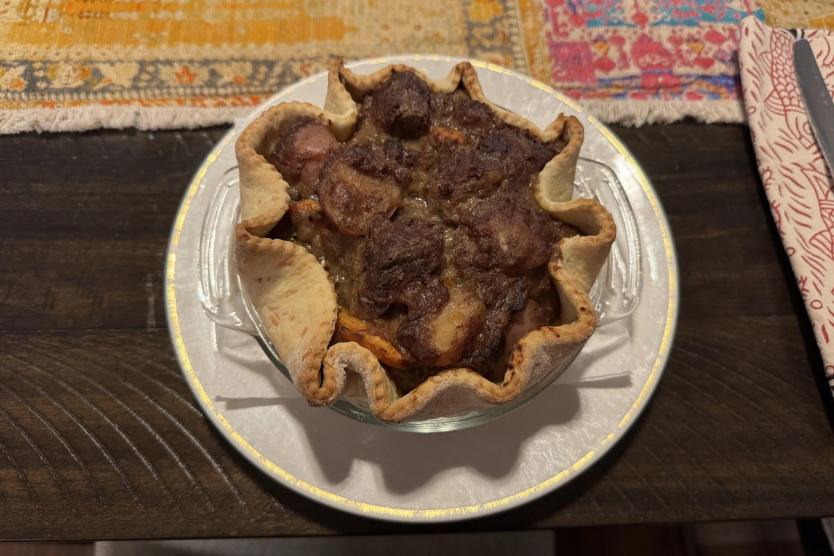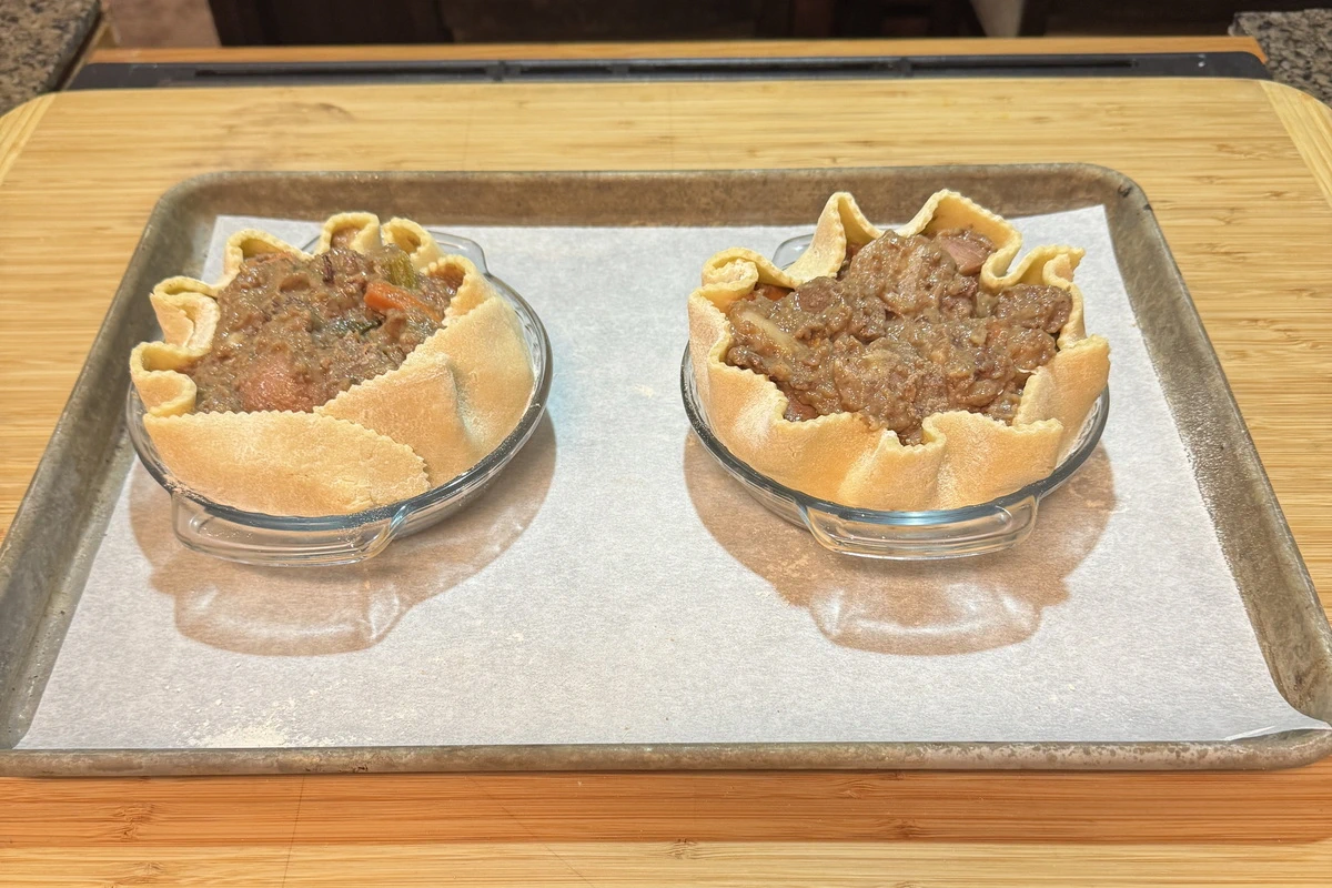 I used individual pie plates and filled the crust with the cold leftover stew and crimped the crust over. And then into a 425° F oven for about 40 minutes.