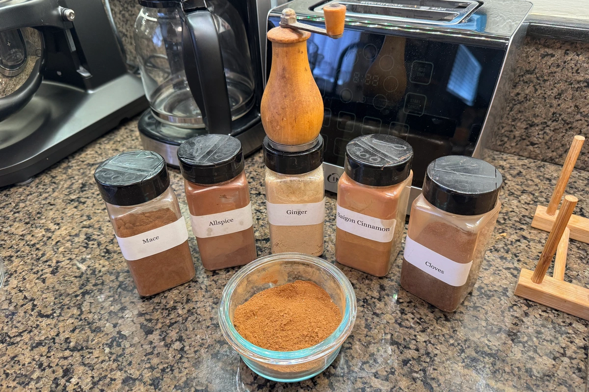 It’s a bit cinnamon-forward, because that’s the first flavor I associate with Fall. Then comes the ginger and cloves, mace and allspice to add a background punch. Nutmeg to pull it all together.