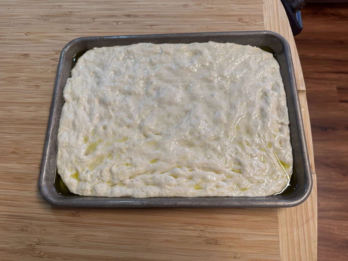 Punch down the dough and transfer it to a well-oiled baking tray (use the reserved 1/4 cup olive oil). Stretch the dough to fill the pan.
