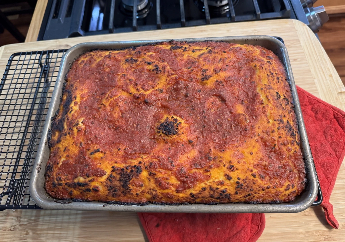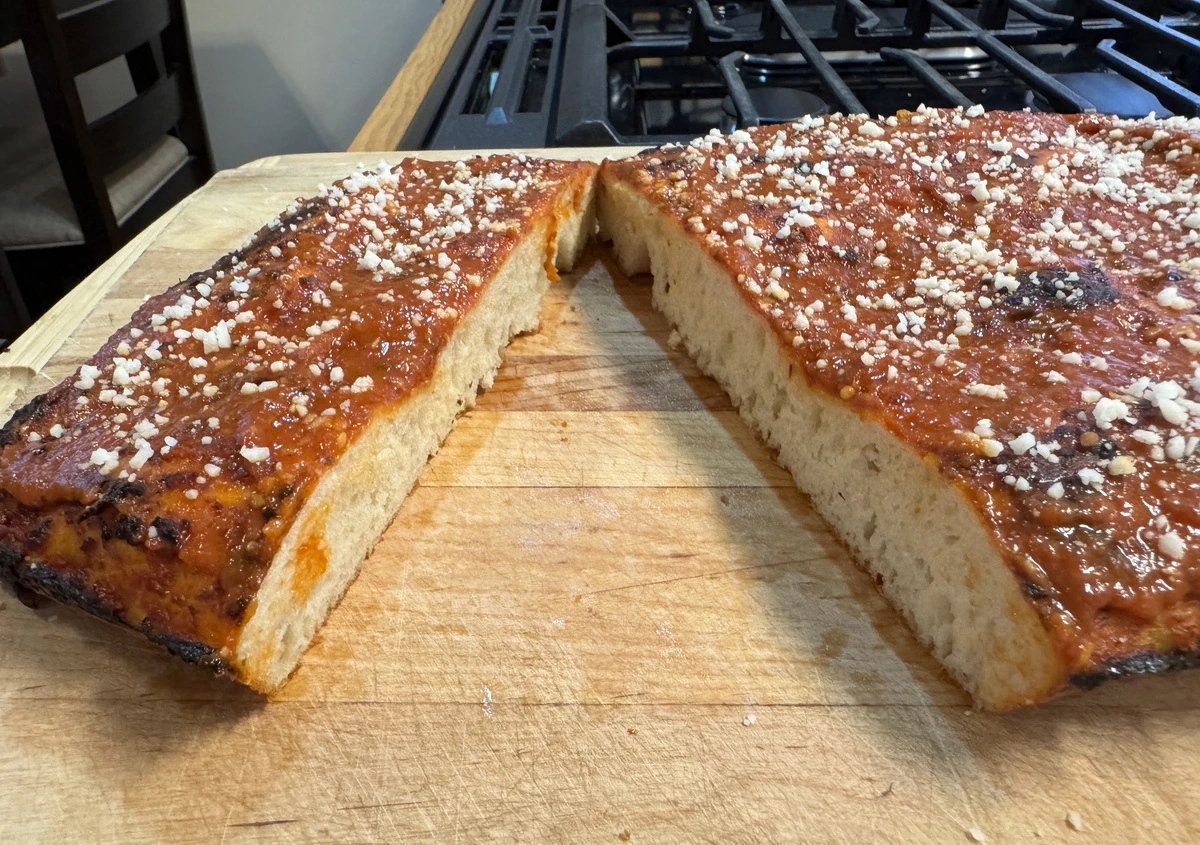 Crispy bottom crust, chewy crumb, and a really rich, tomato topping. Seriously good.