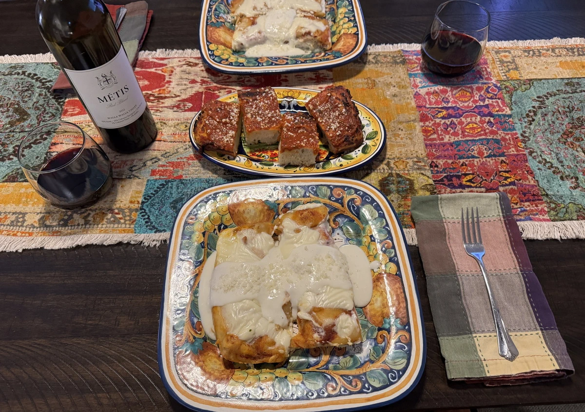 Since we were going to have a fresh Tomato Pie for dinner, it was decided we needed a fresh pasta entrée to go with it. Fortunately, we had Homemade Cannelloni in the freezer! Instead of a red sauce, this time we did a Salsa Colla – or Besciamella as it is known in Italy. We call it Béchamel or a simple white sauce. And simple it is… equal weights of flour and butter, and then milk to desired consistency. A pinch of salt, white pepper, and a grating of fresh nutmeg is all it takes!