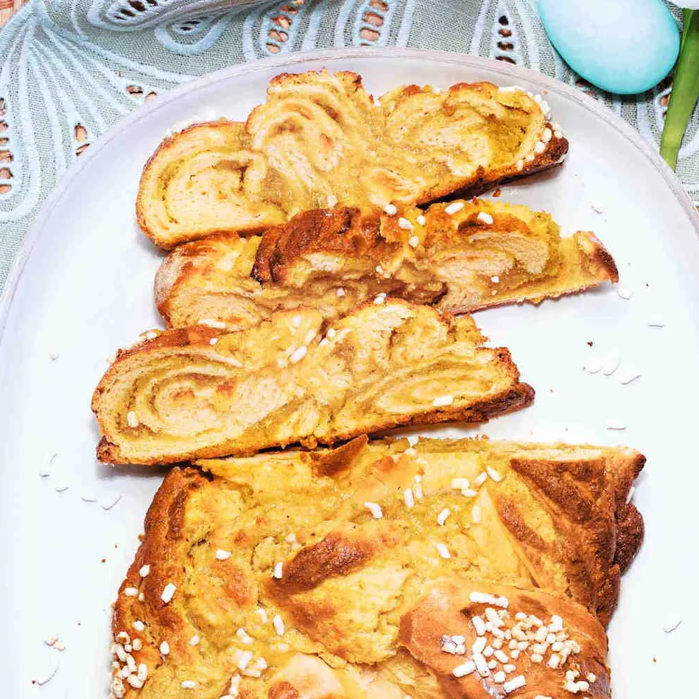 The photo reminded me of a coffee ring we used to make back in the ’60s at The Donut Center in San Francisco – my first job. In reality, they were very different in appearance – it was the way it was laminated. I didn’t get a photo of mine cut – this is from the La Cucina website. It was the photo that made me say “immediately!” And how fortuitous that Easter was mere days away!