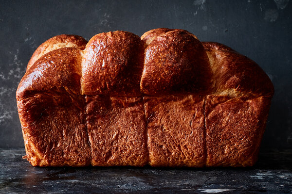Apply egg wash and bake the loaves: Brush the surfaces of the proofed loaves generously with the beaten egg and transfer the pans to the oven. Bake side by side, rotating each pan 180 degrees and left to right after 15 minutes, until the surfaces have risen dramatically and are deeply browned, 25 to 30 minutes. Let cool completely in the pans, then cut along the short sides with a paring knife to loosen. Use the parchment paper to lift the loaves out of the pans. Slice with a serrated knife.