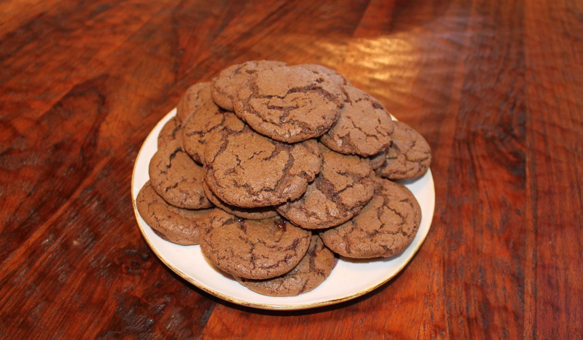 Heat oven to 350°F. Cream the butter and sugars in a large bowl. Add the egg and vanilla. Sift together the flour, cocoa, baking soda, baking powder, and salt. On low speed, add the dry mixture to the butter mixture. Beat until fully incorporated. Fold in the chocolate chips.
