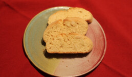 Cool completely. Slice into 1/2″ slices and toast on both sides in 350° oven for another 15 or so minutes.